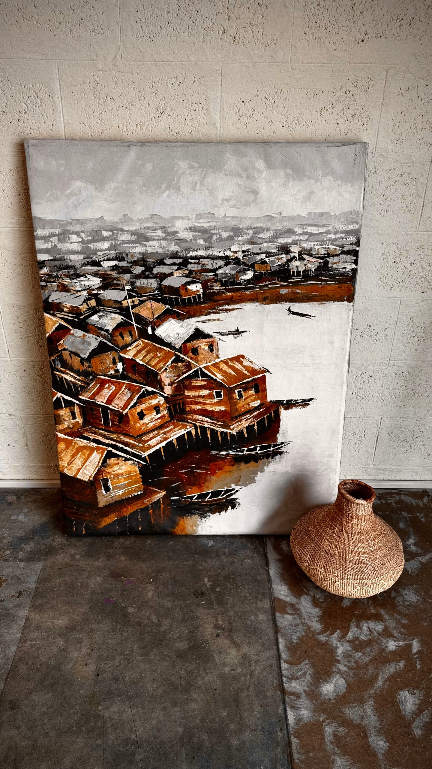 african rooftop wall art dubai, neutral african suburb print uae, earthy canvas art middle east, minimalist african home decor, heritage artwork dubai