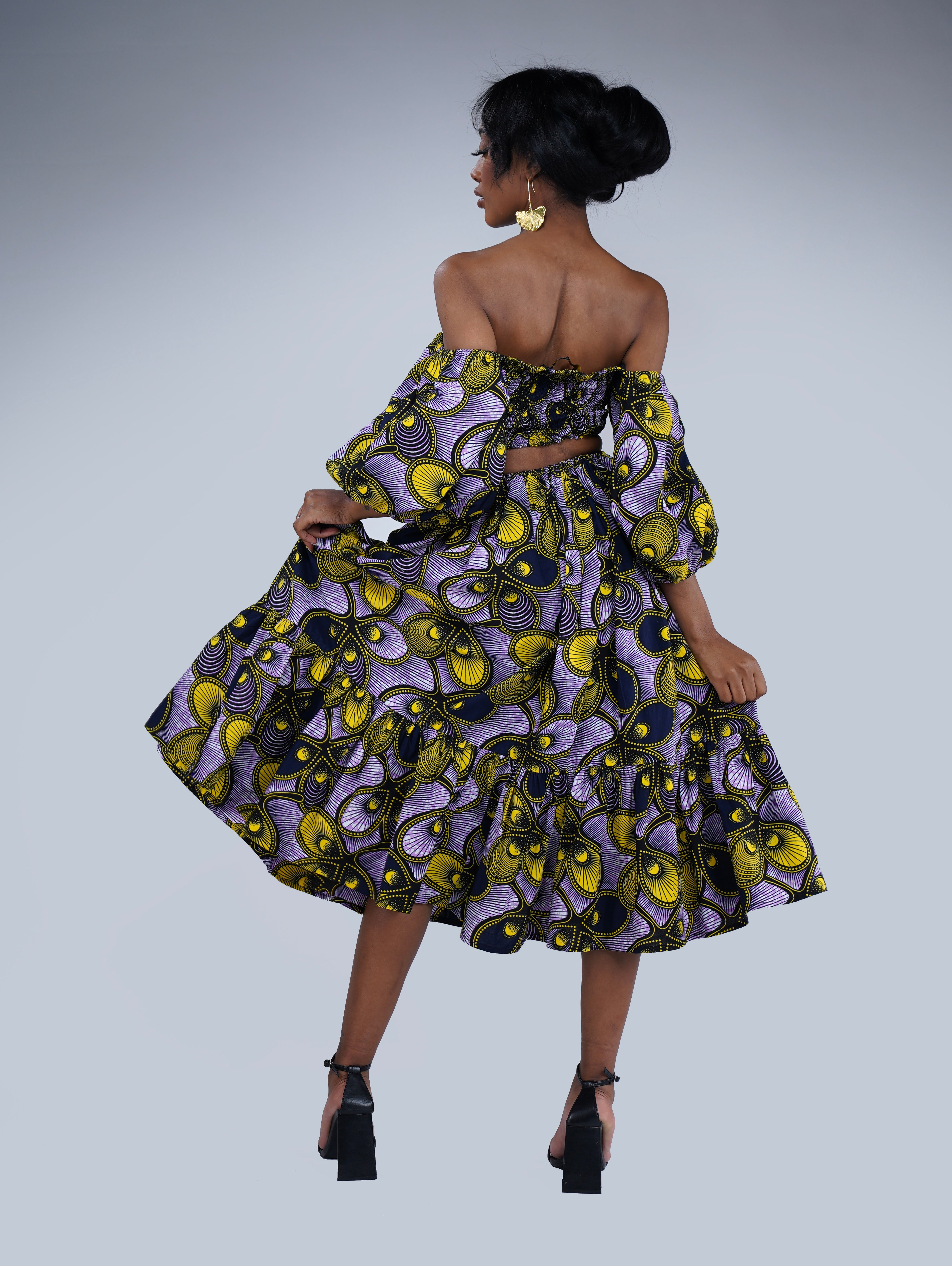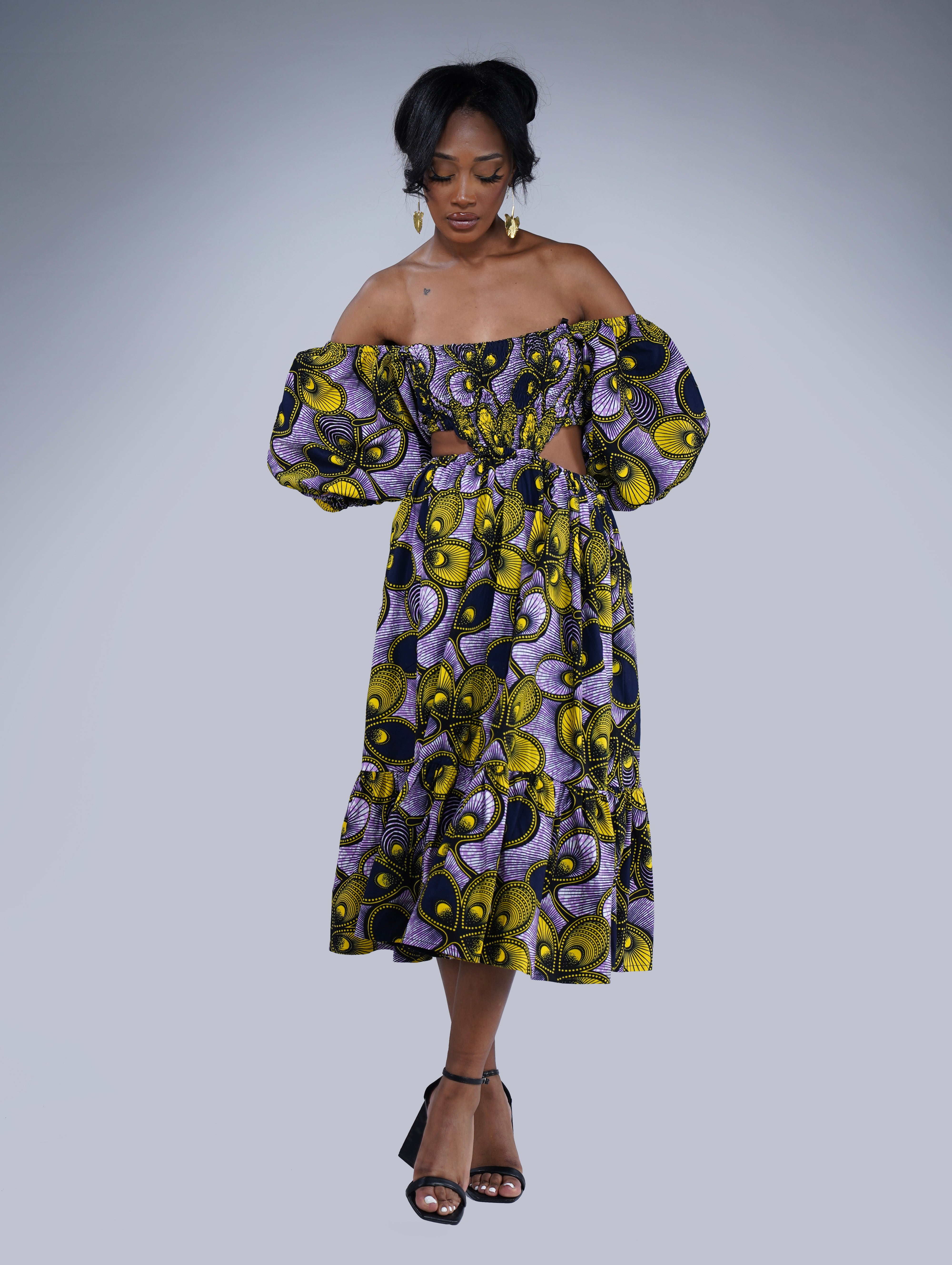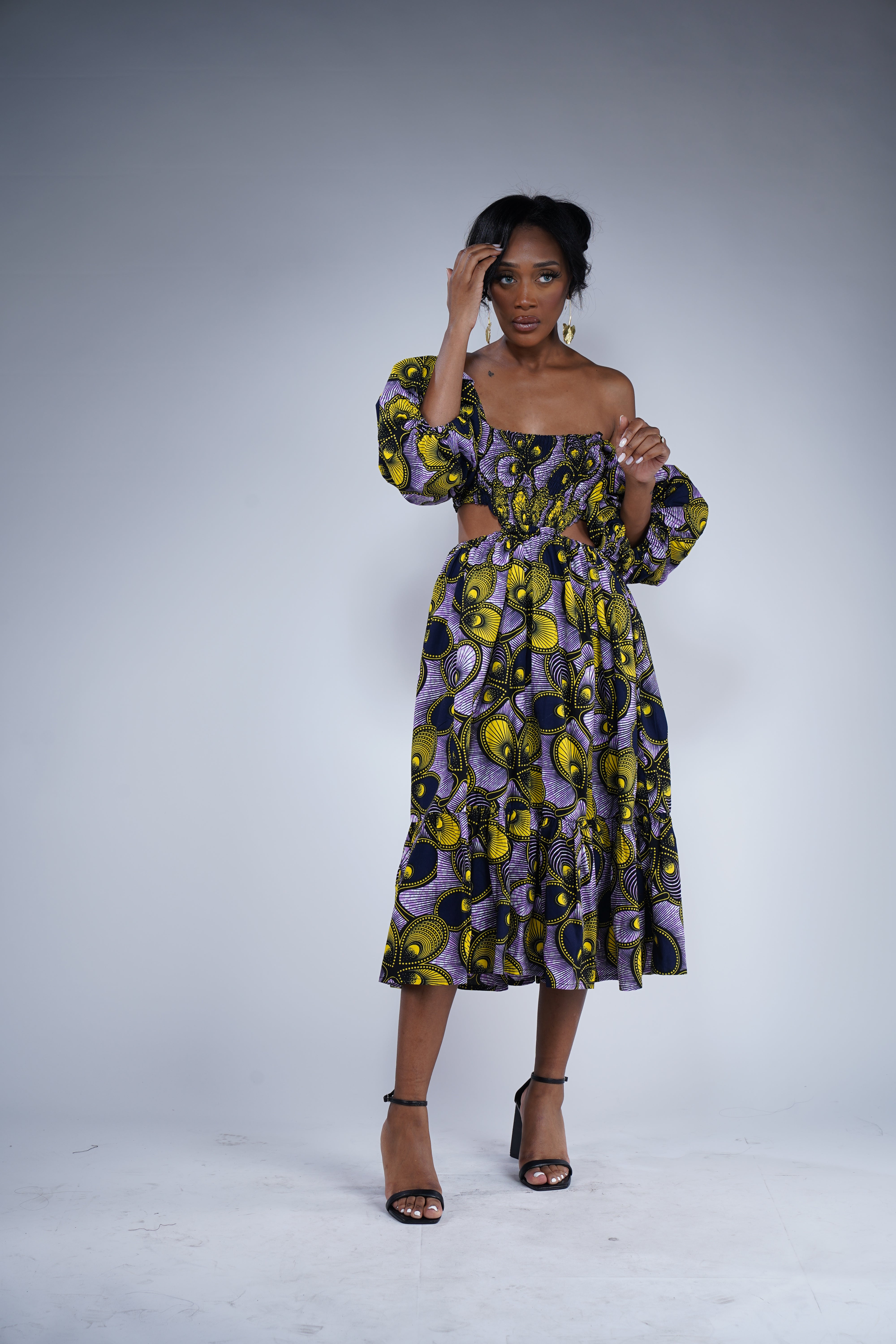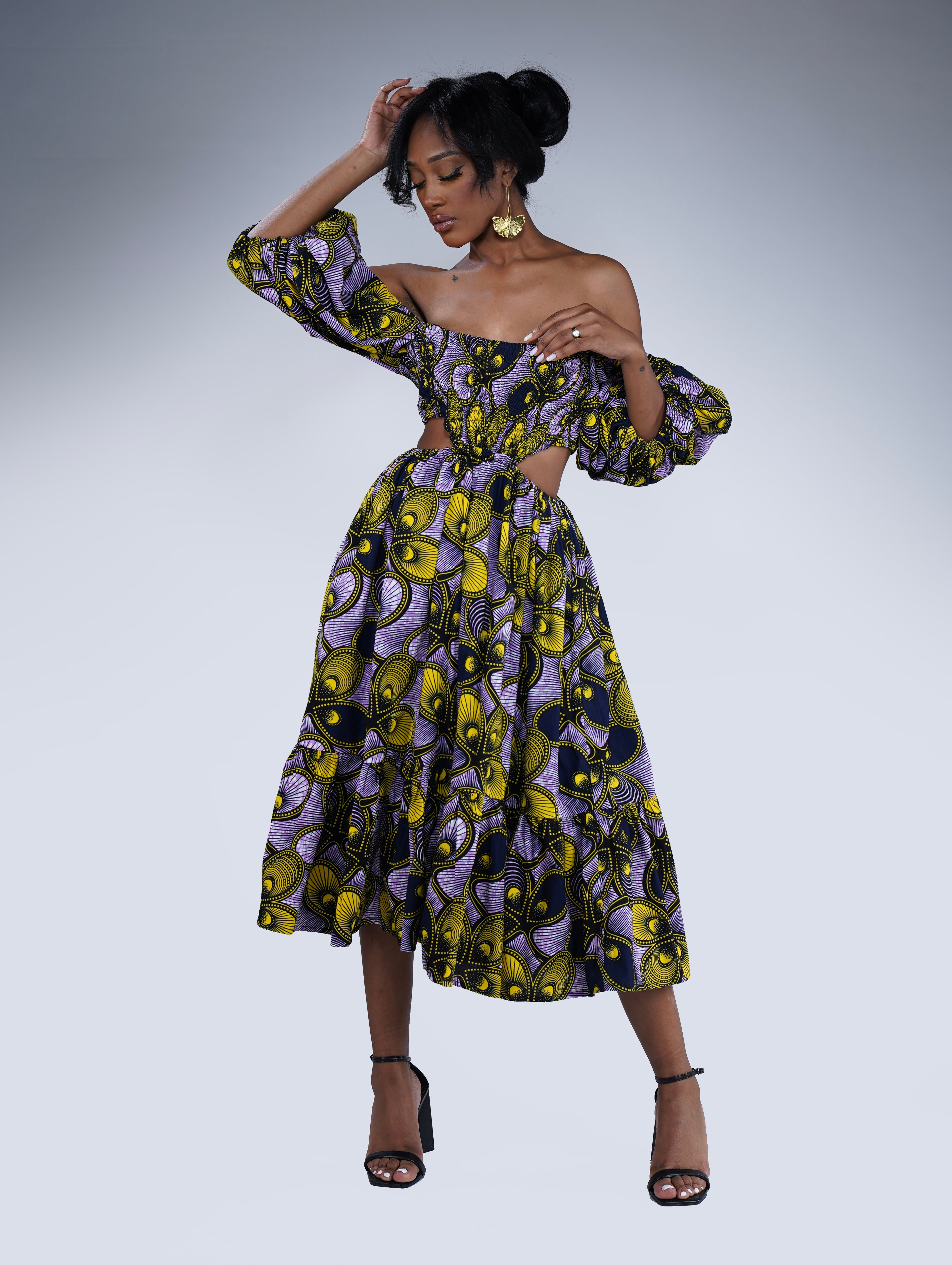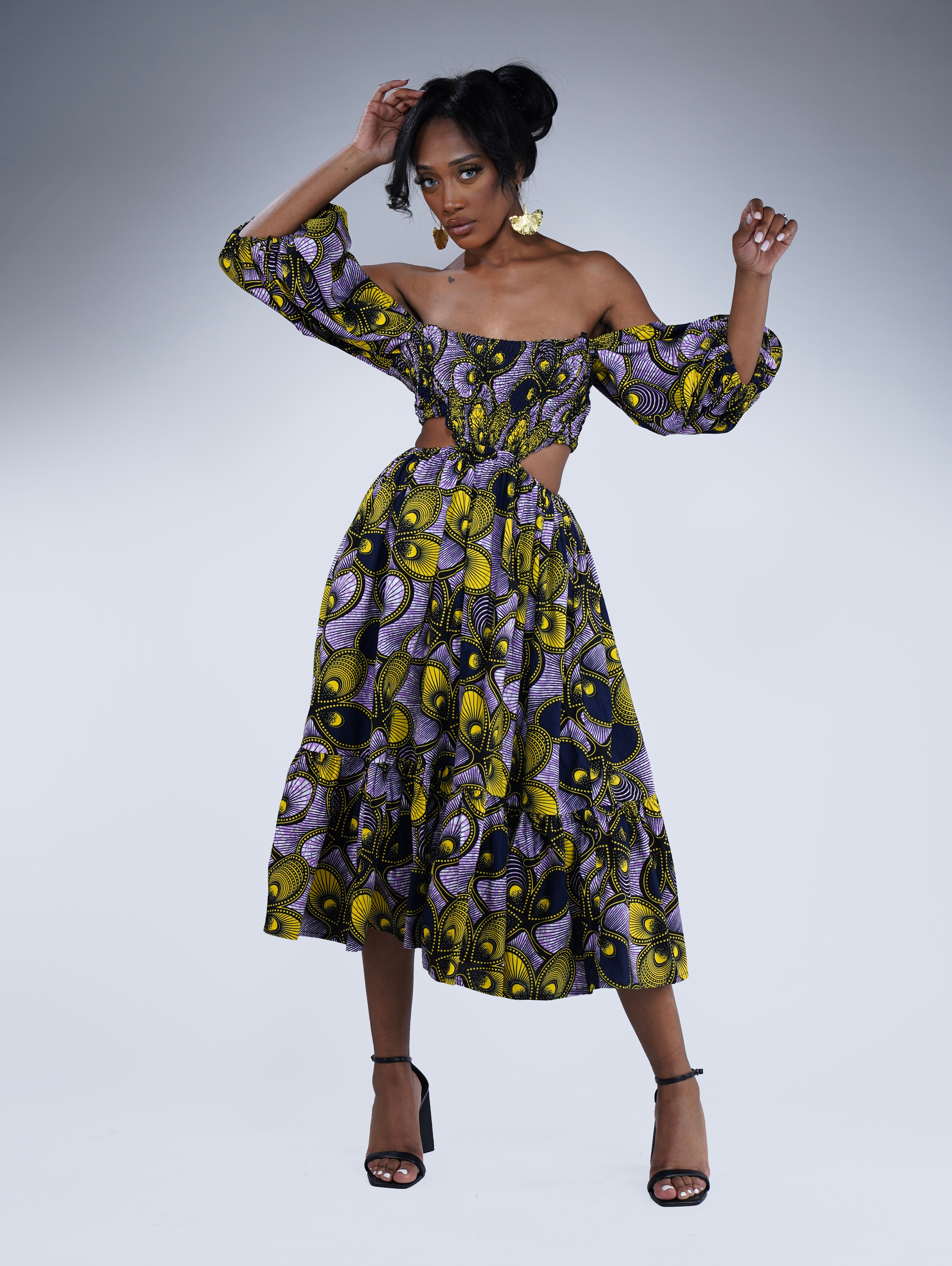 Make a bold statement with the Diallo Dress — a vibrant African print midi dress inspired by West African textile artistry.
