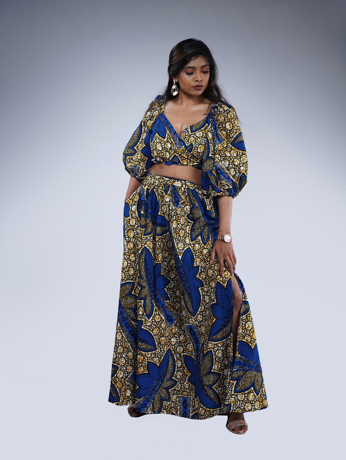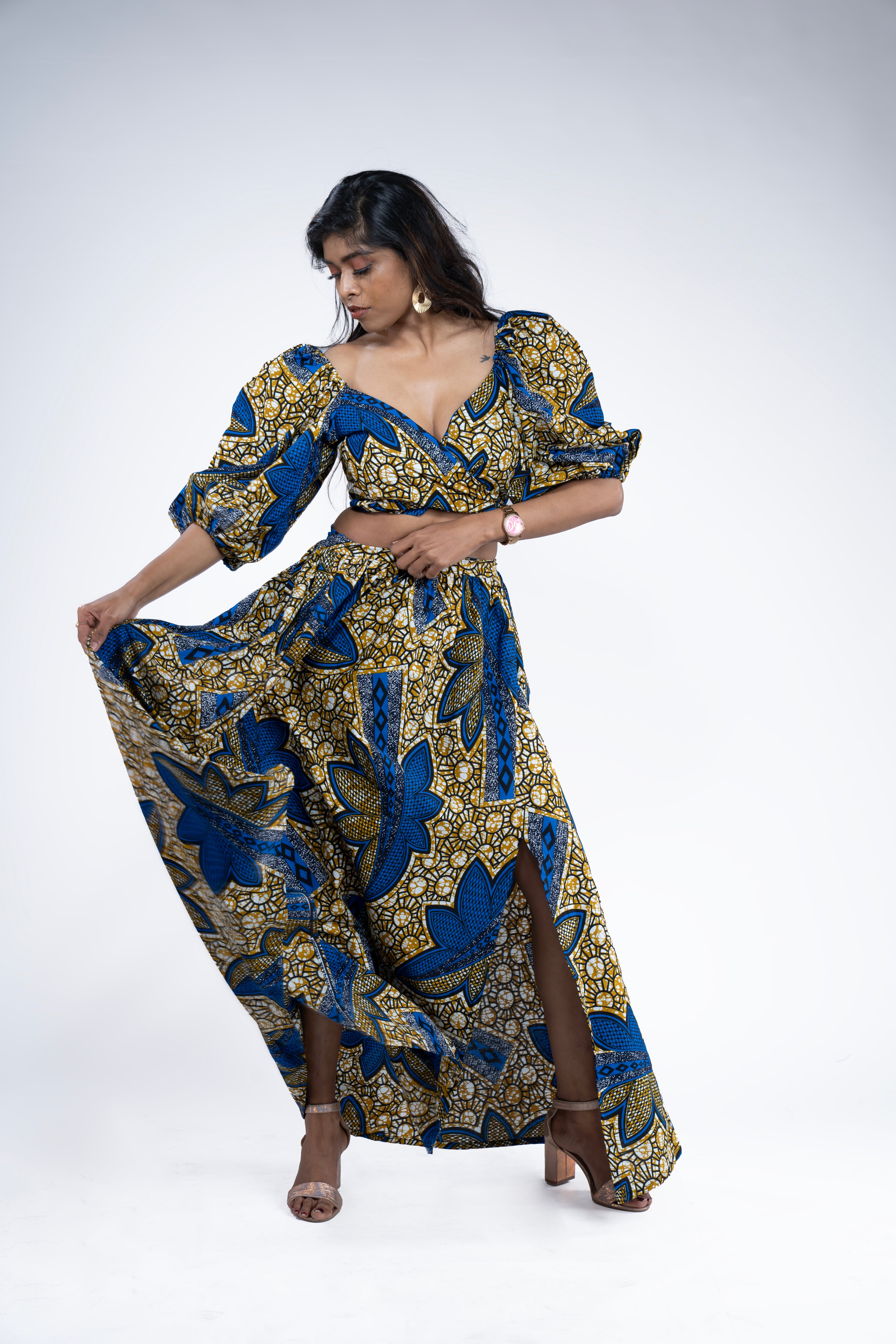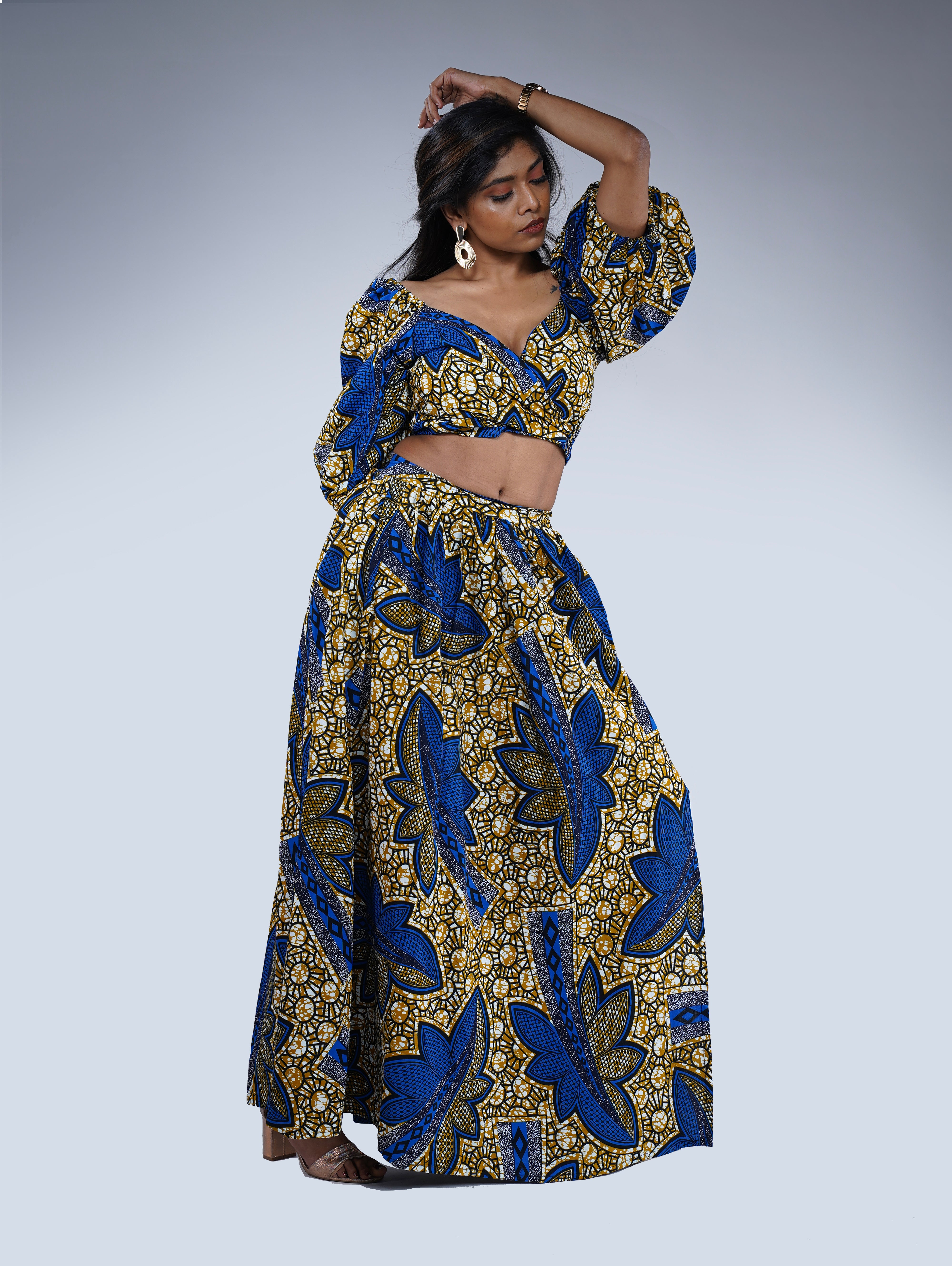Step into the world of African-inspired fashion with the Netha Set. This exquisite set features a gathered maxi length skirt and a stylish off-shoulder crop top, both crafted from 100% African print cotton fabric. The vibrant blue and brown African print pattern adds a touch of cultural richness to your wardrobe.