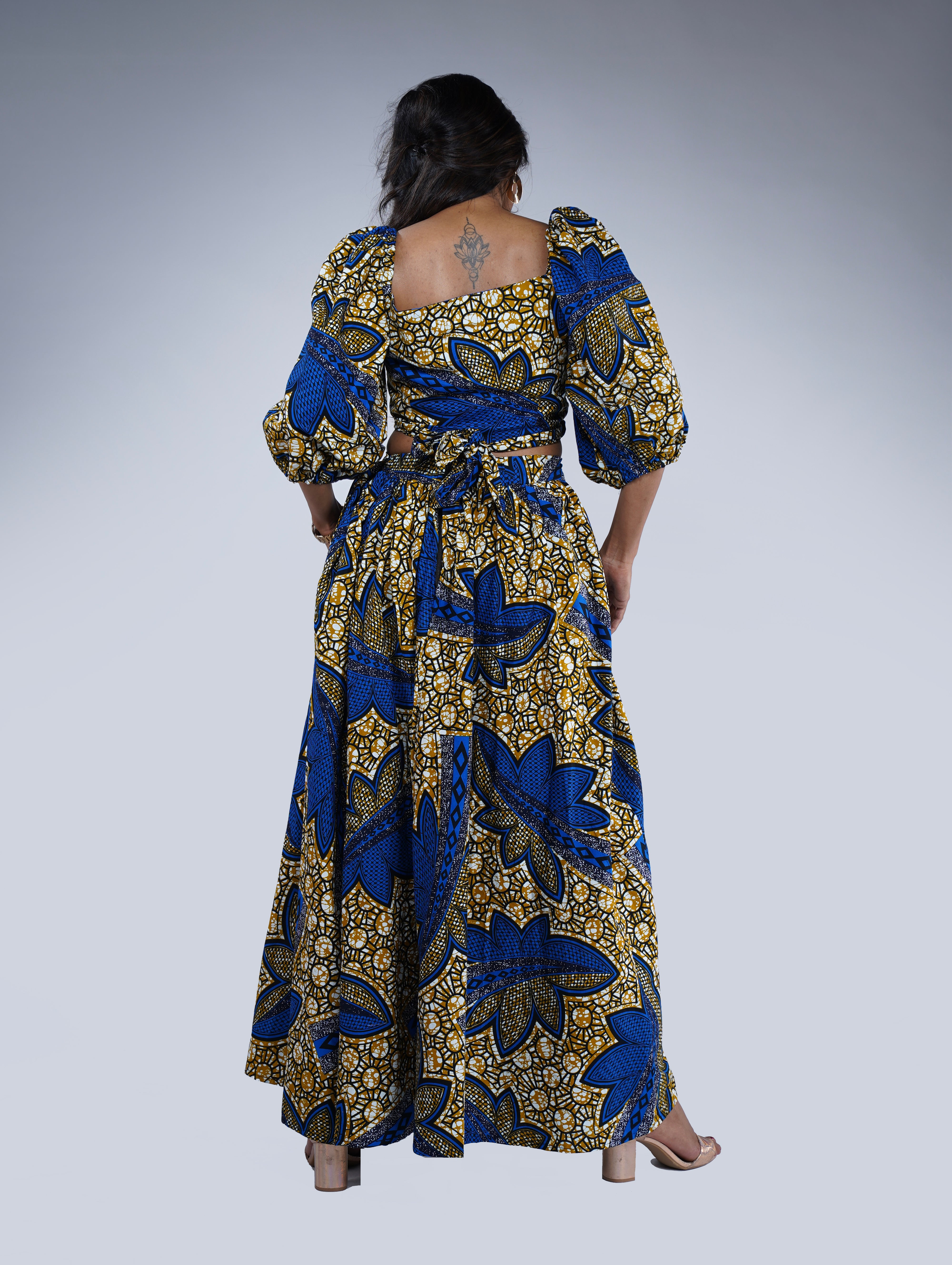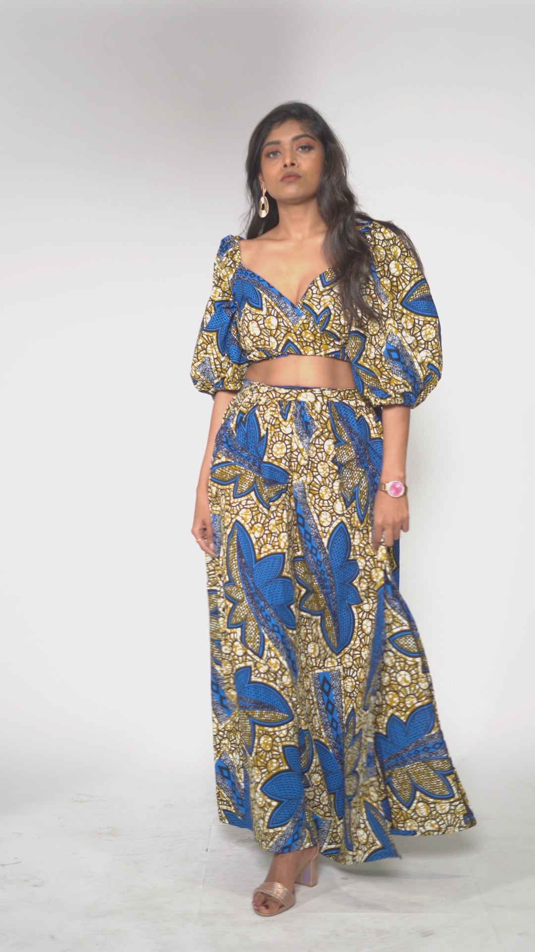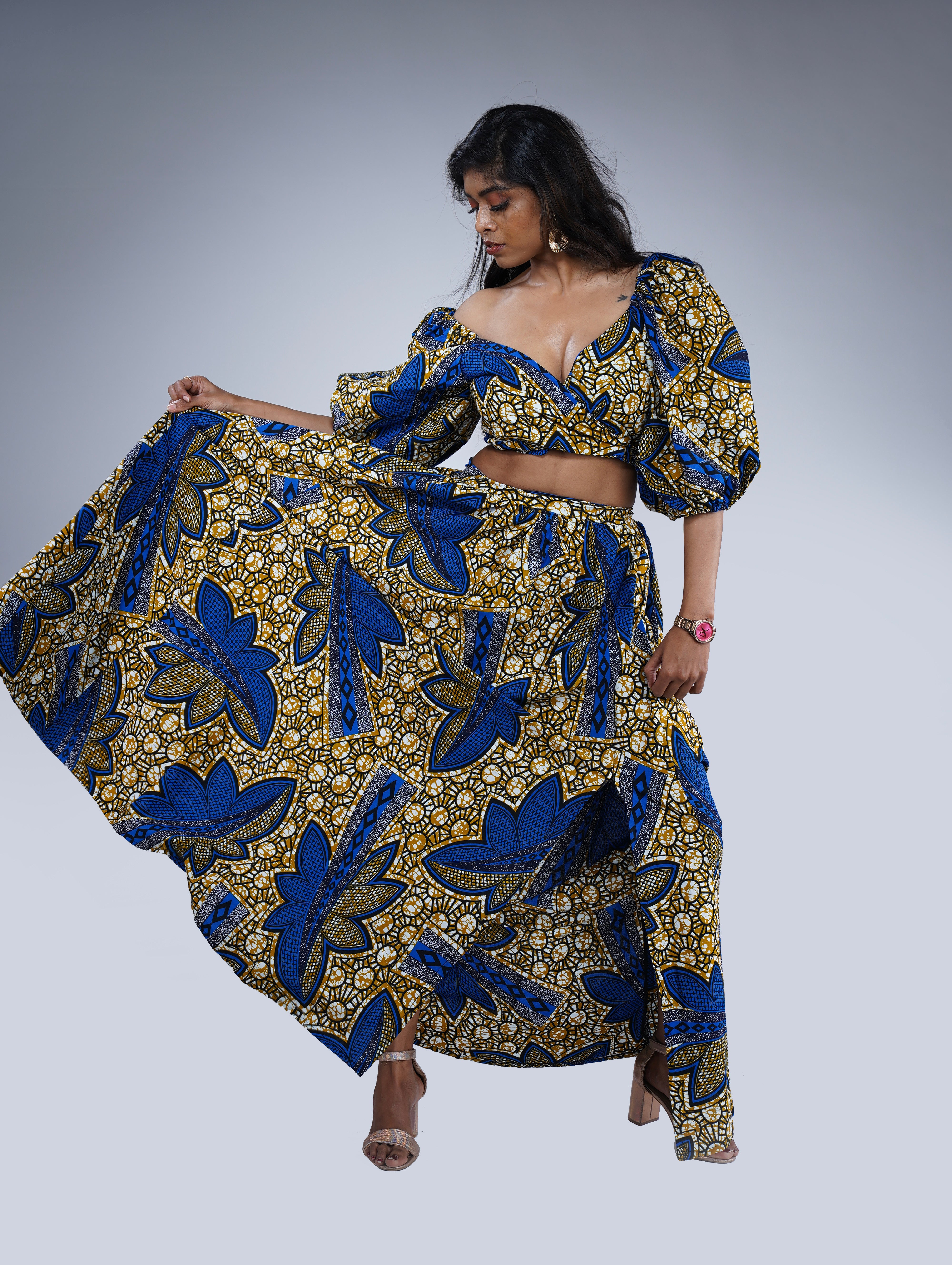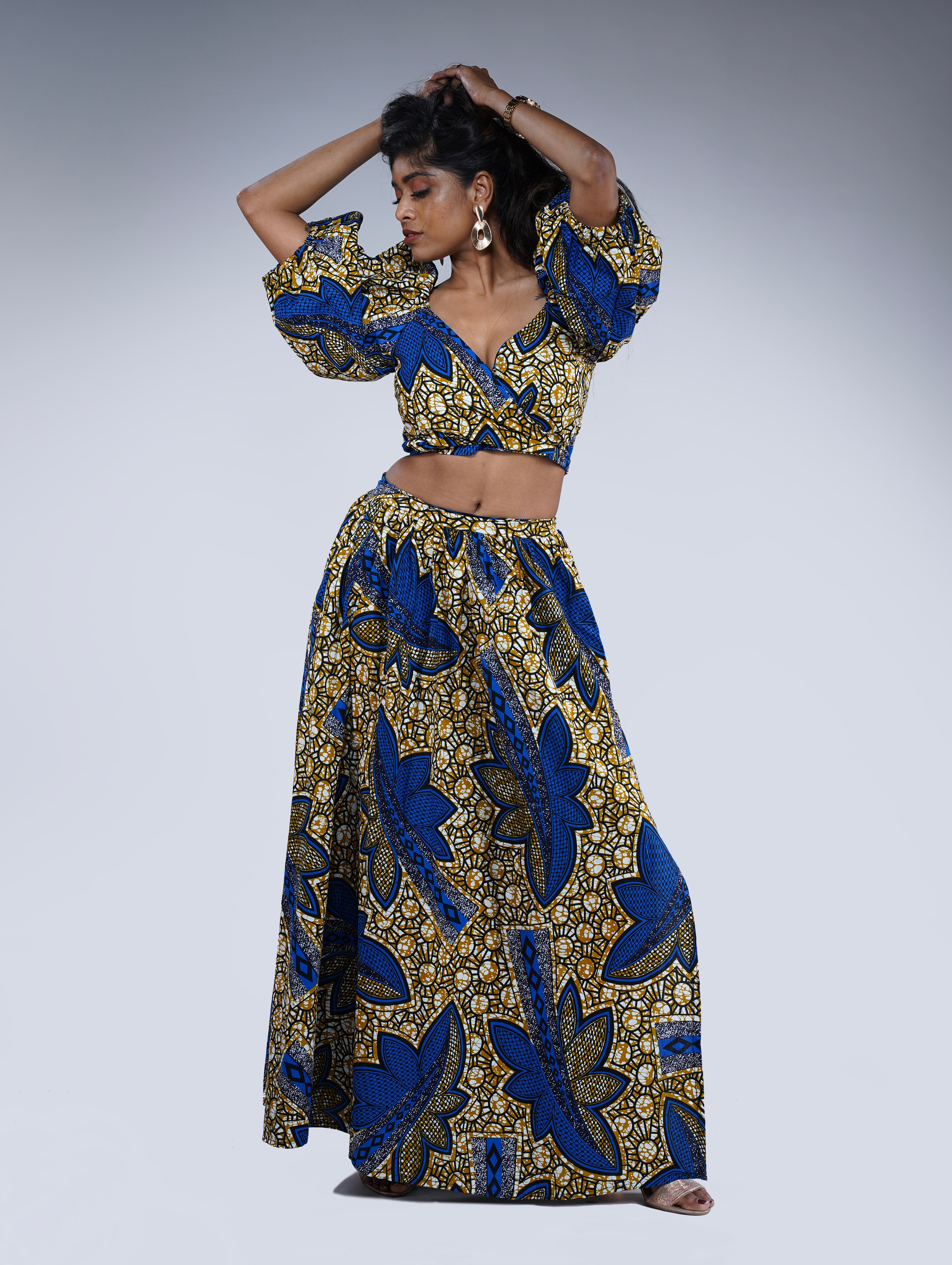 Step into the world of African-inspired fashion with the Netha Set. This exquisite set features a gathered maxi length skirt and a stylish off-shoulder crop top, both crafted from 100% African print cotton fabric. The vibrant blue and brown African print pattern adds a touch of cultural richness to your wardrobe.