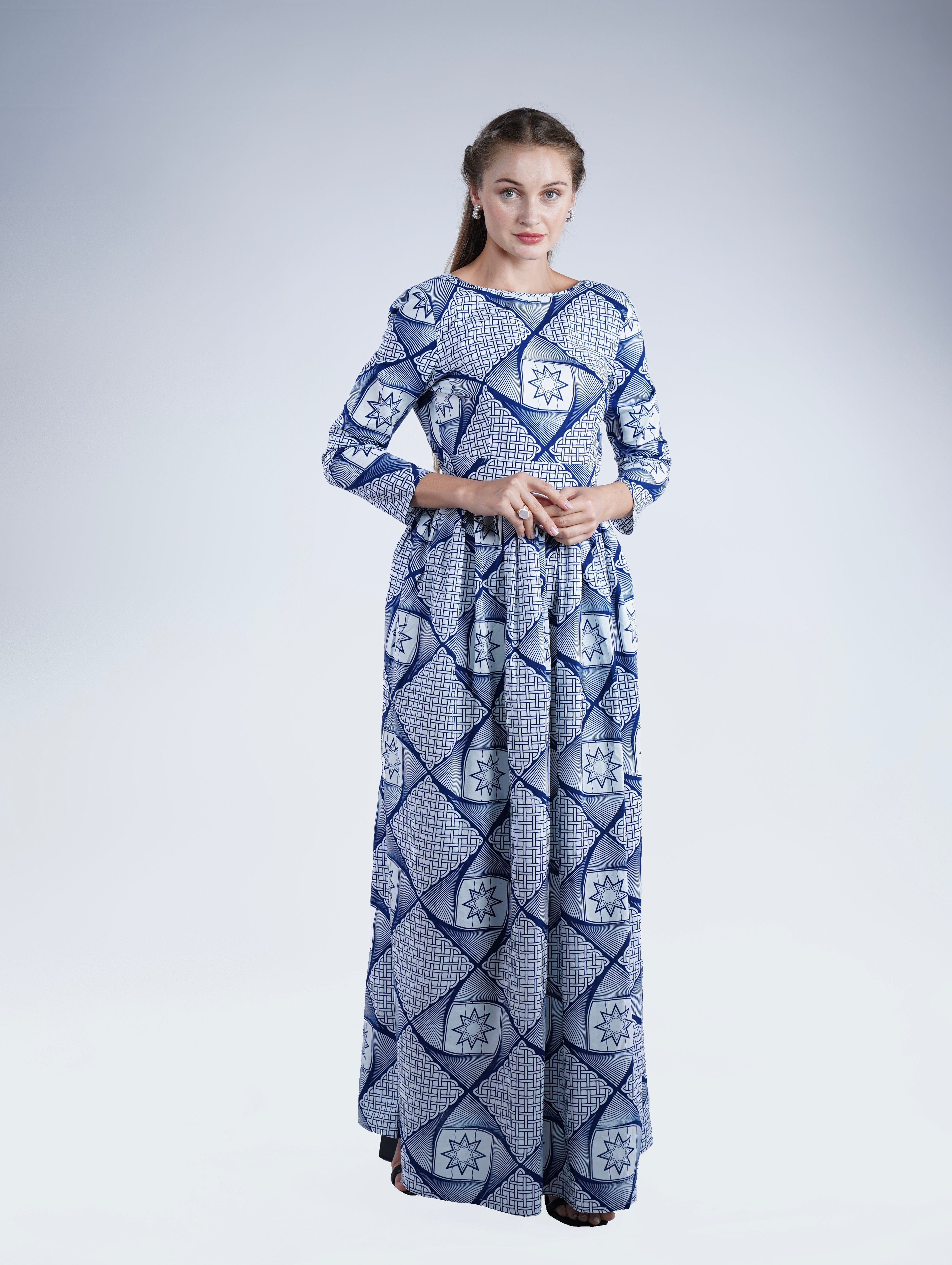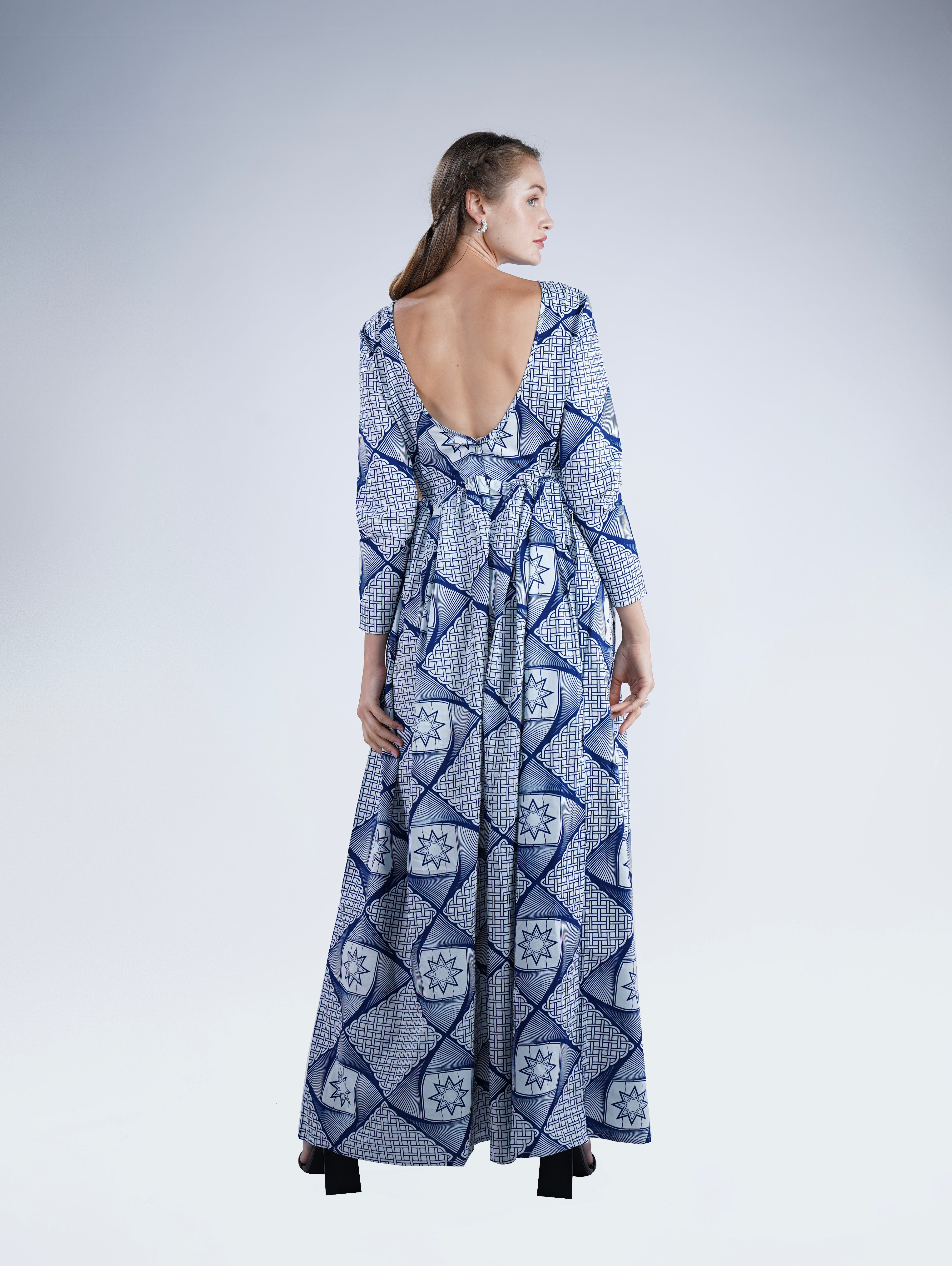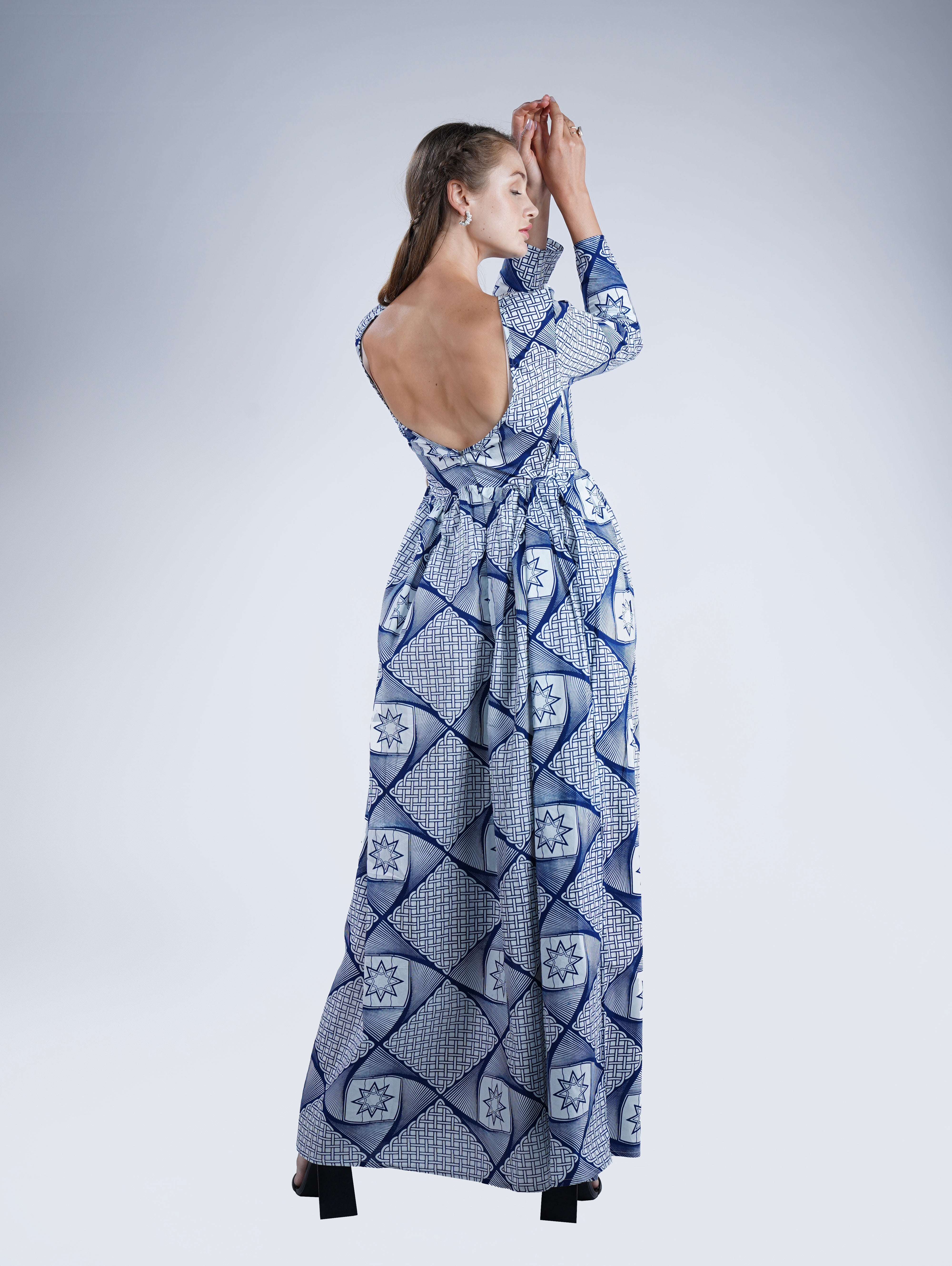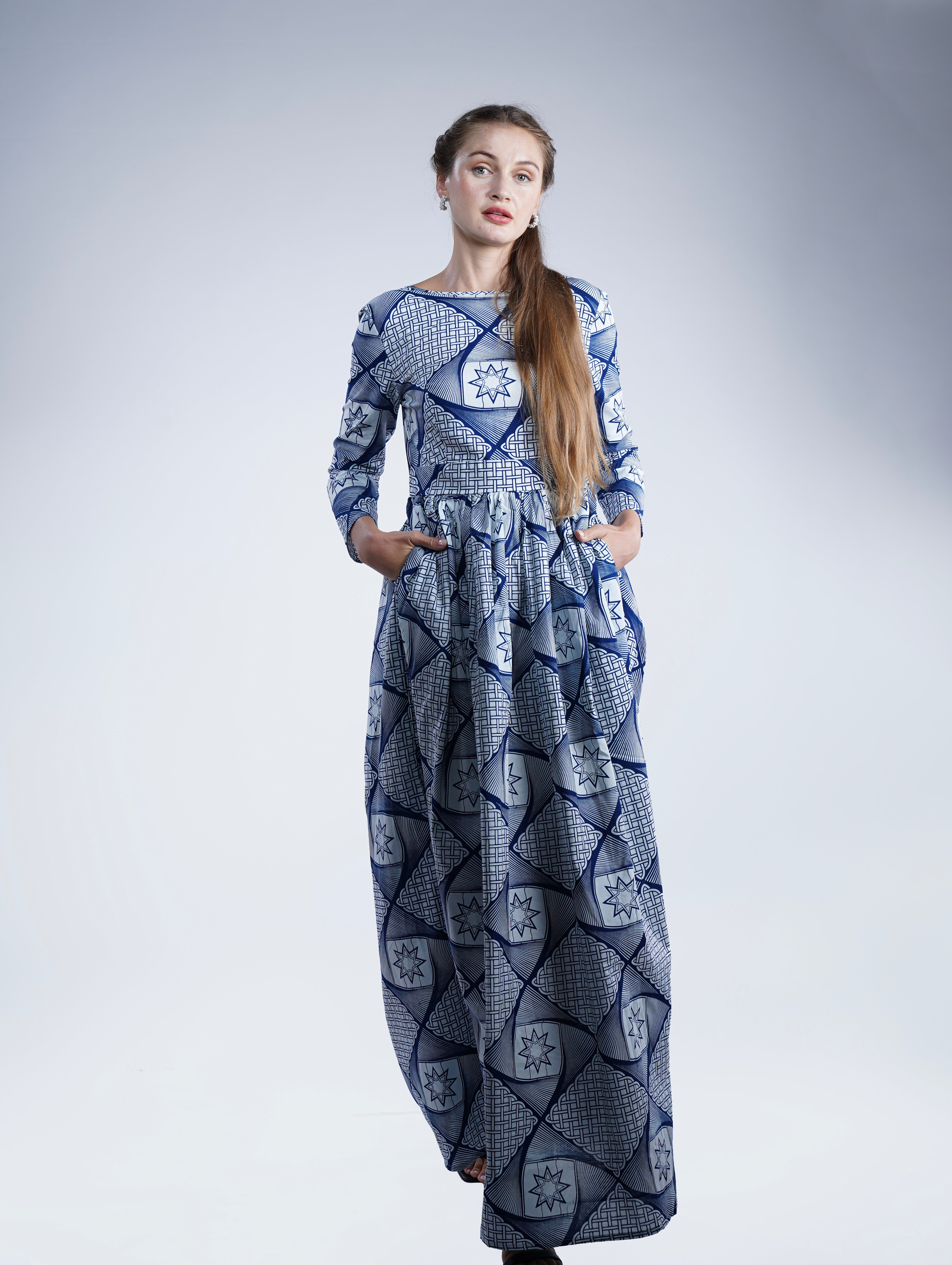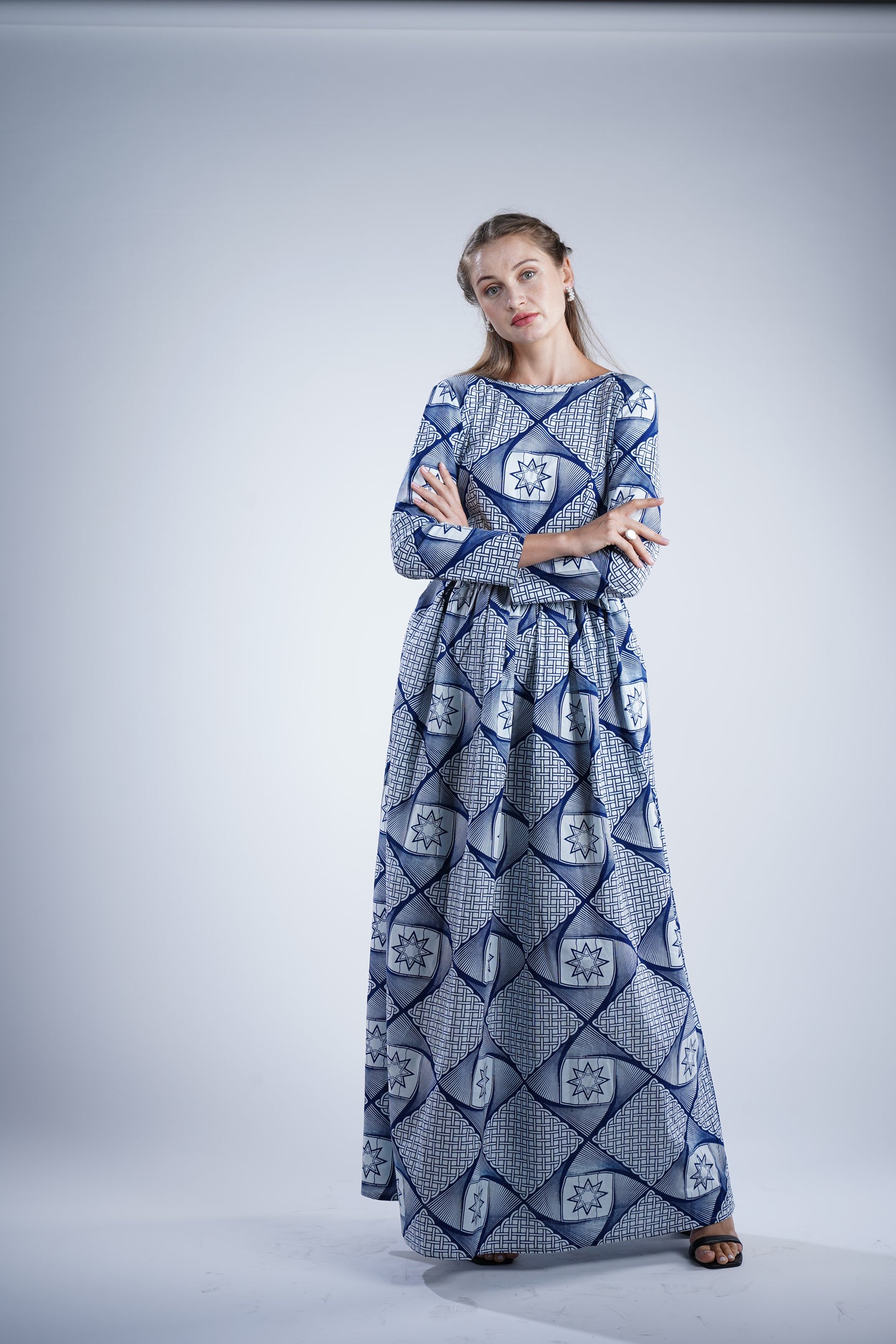 Introducing the Lelani dress by Blumilondon - a stunning masterpiece that beautifully merges African tradition with contemporary fashion. Made from 100% cotton, this maxi length dress showcases a captivating blue and white African print pattern that exudes elegance and individuality.