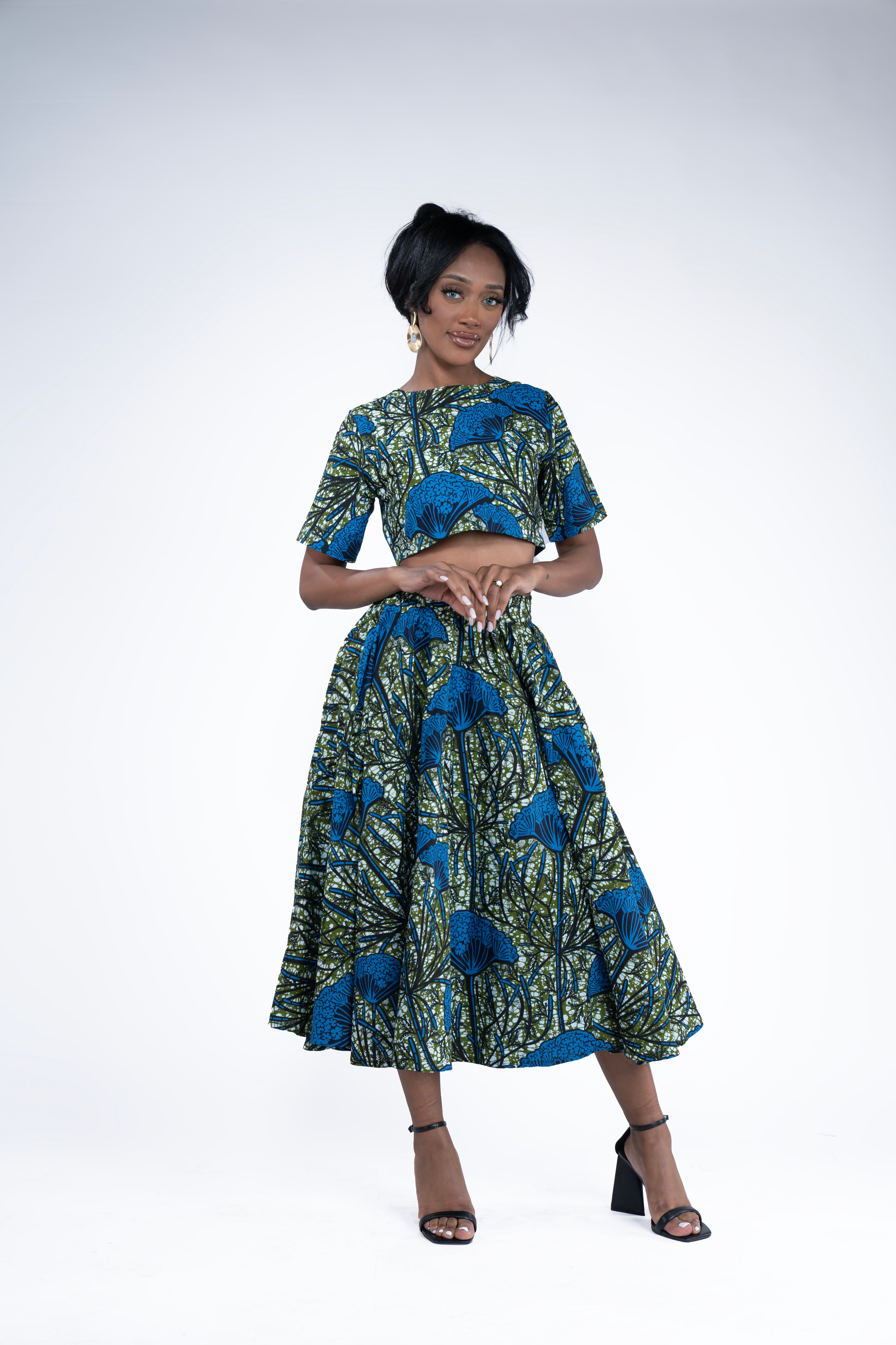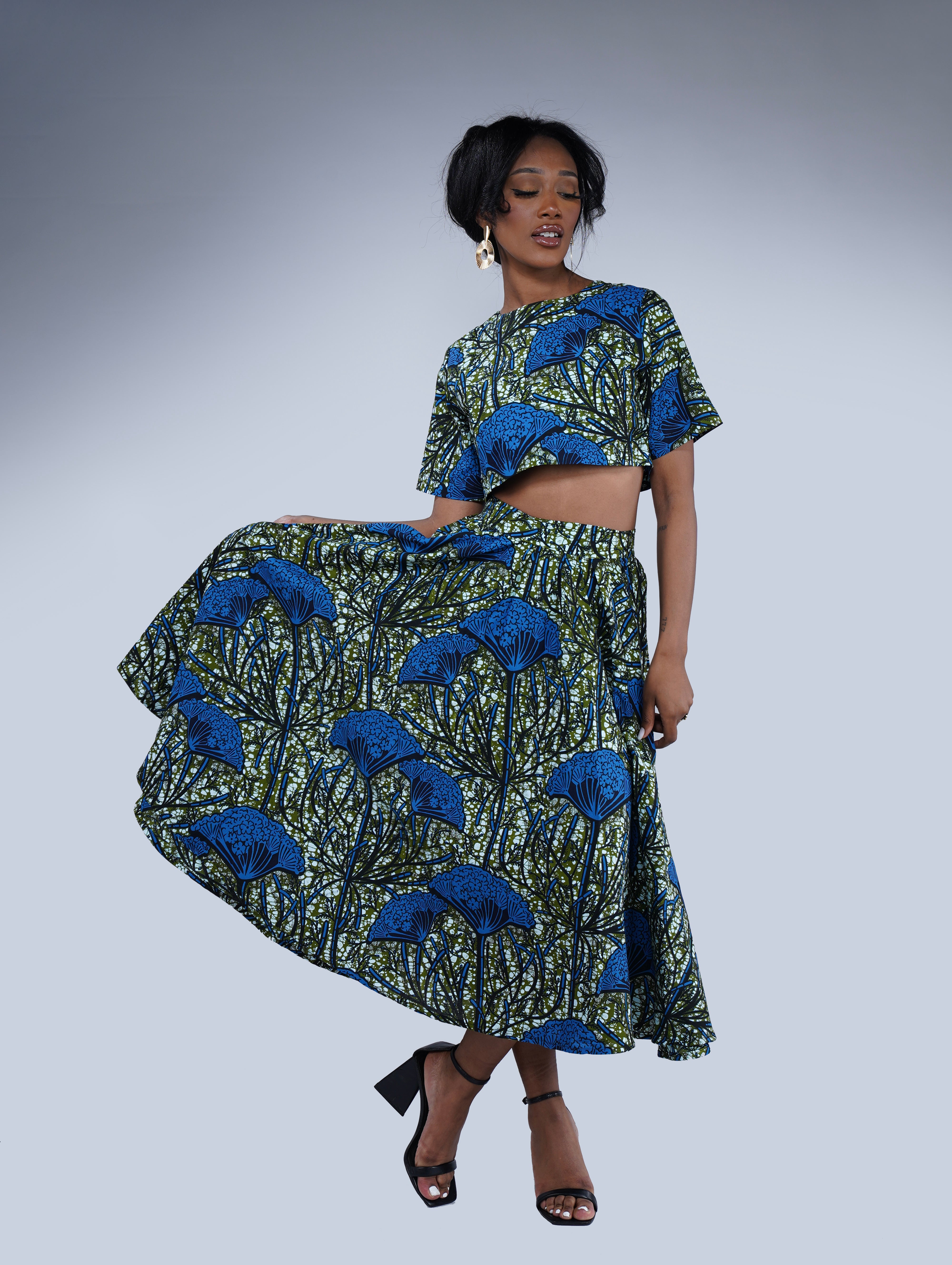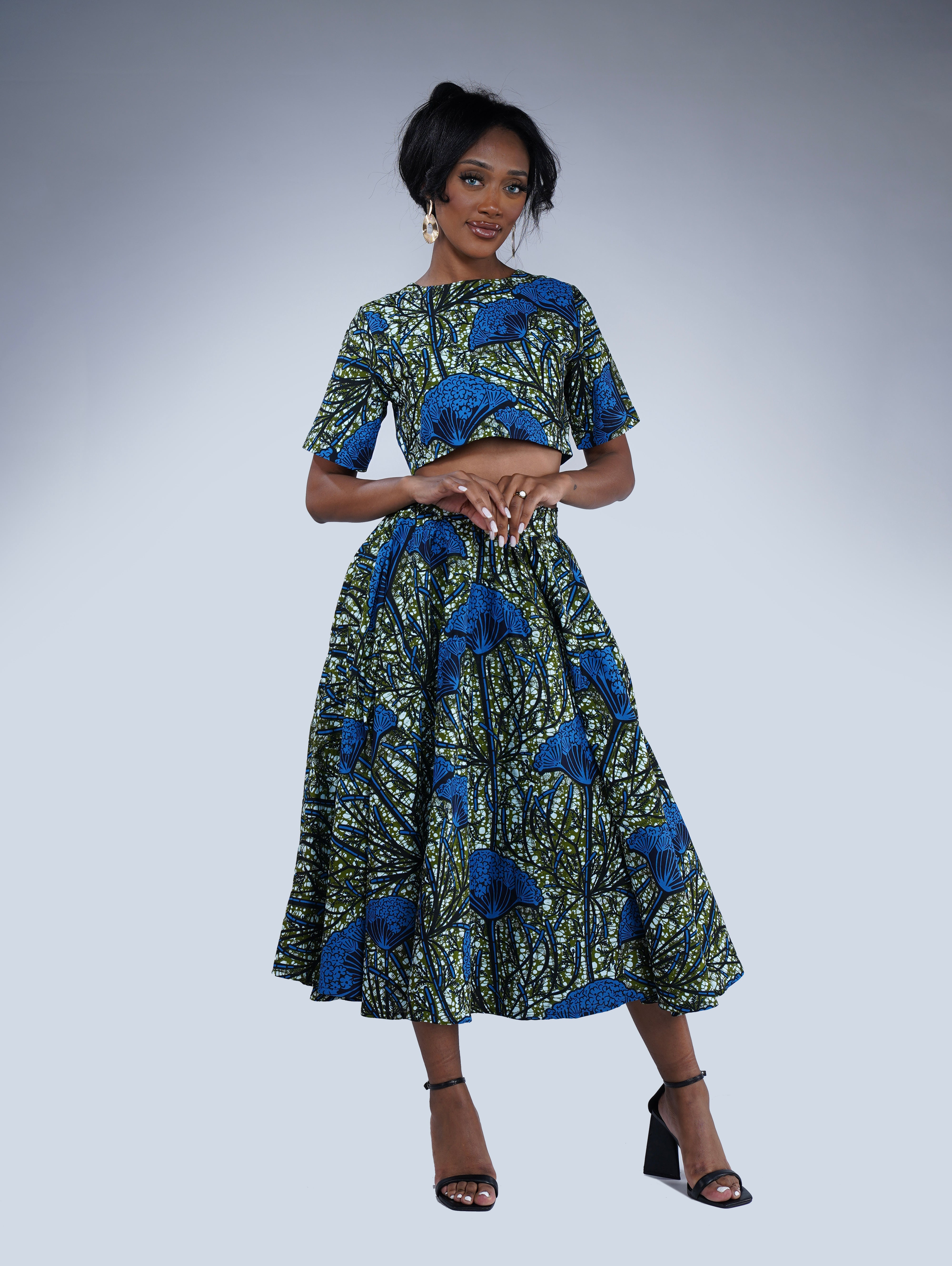 Step into the vibrant world of African fashion with the Mbali set. This stunning ensemble features a circle midi length skirt and a short sleeve crop top, both meticulously crafted from 100% African print cotton fabric. The rich blue and green pattern pays homage to the beauty of African culture, adding a unique touch to your wardrobe.