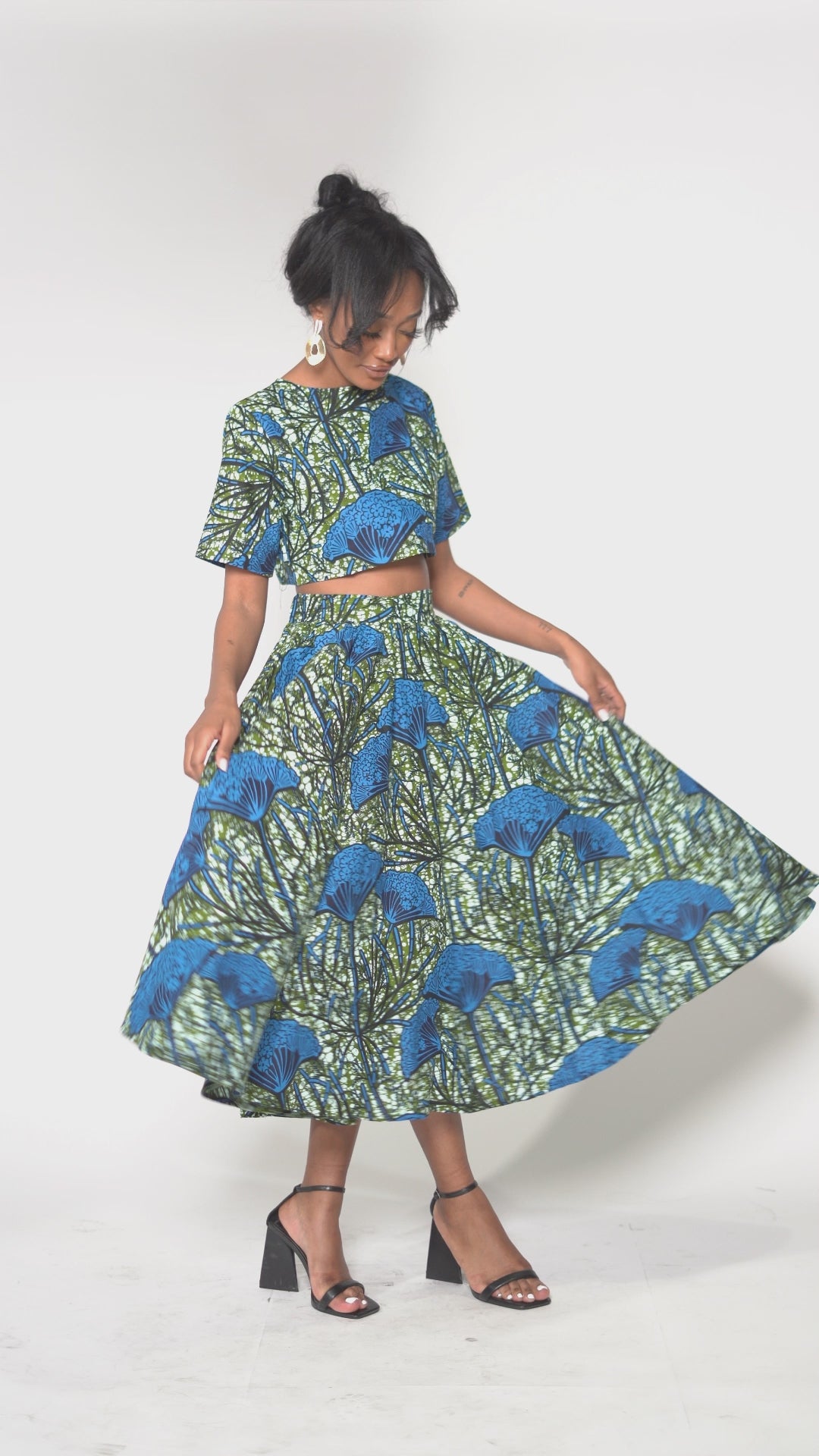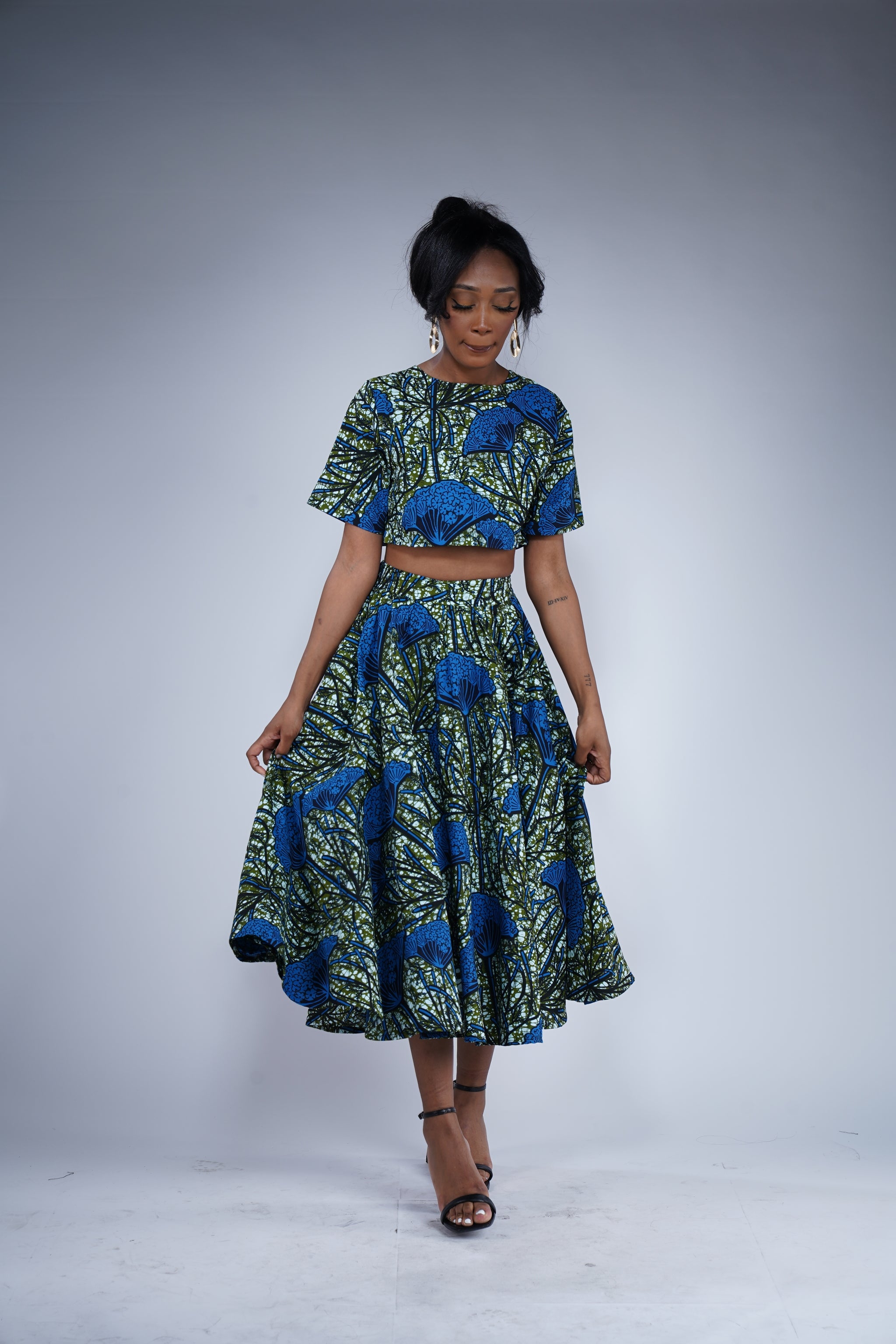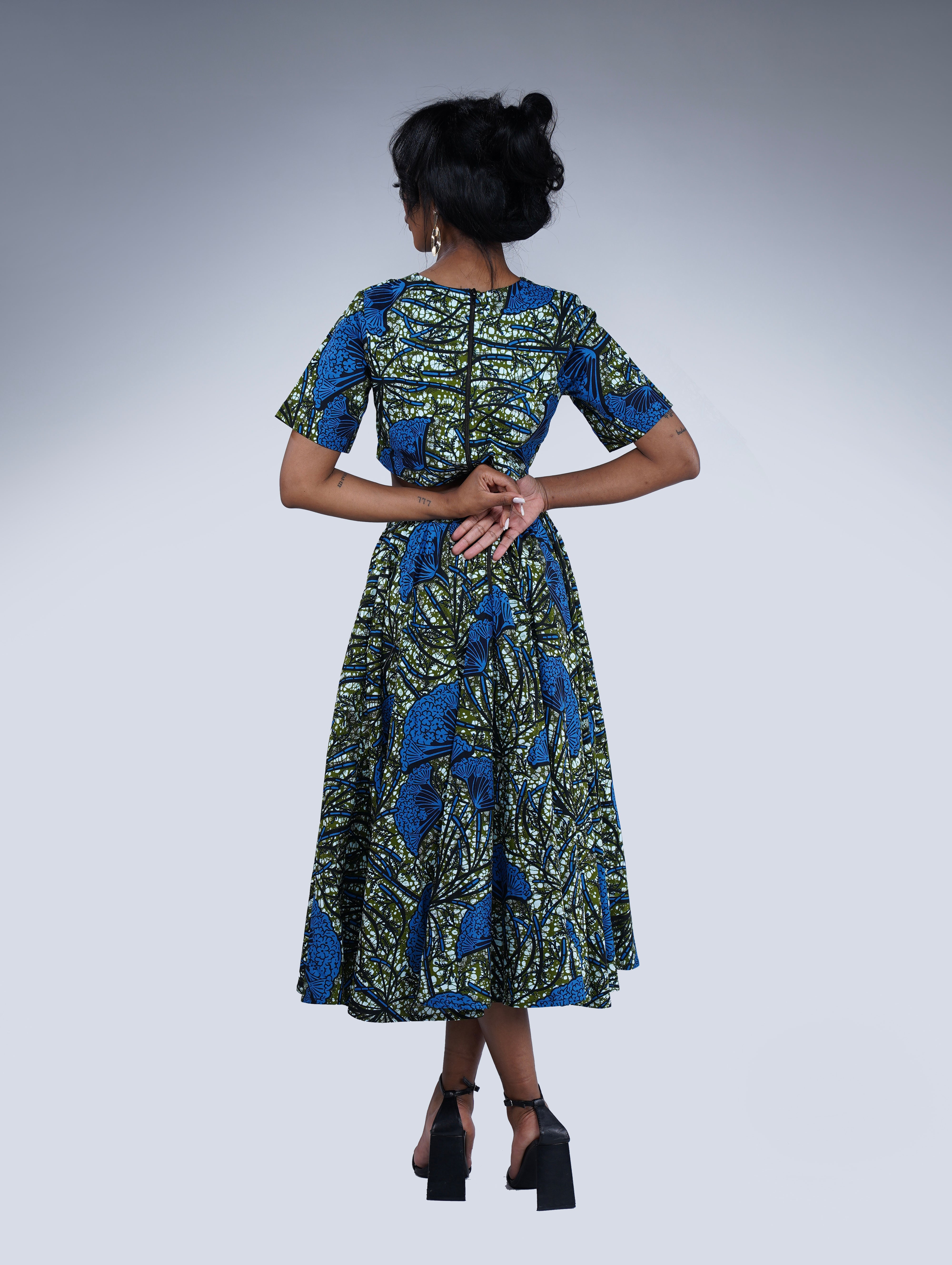 Step into the vibrant world of African fashion with the Mbali set. This stunning ensemble features a circle midi length skirt and a short sleeve crop top, both meticulously crafted from 100% African print cotton fabric. The rich blue and green pattern pays homage to the beauty of African culture, adding a unique touch to your wardrobe.